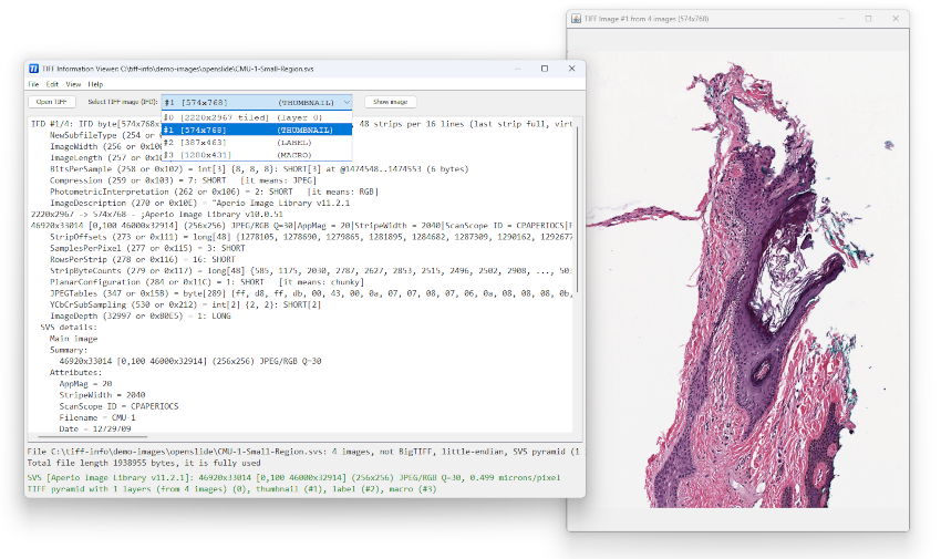 AlgART TIFF Information Viewer is a free portable cross-platform utility (Windows, Linux, macOS, etc.) for inspecting and decoding the structure of TIFF files. It supports most TIFF features including Big-TIFF, any bit depths, and most compressions including JPEG-2000. It displays both the image and detailed TIFF tag structure, allowing you to explore and understand TIFF files in depth. Additionally, it recognizes and shows metadata for popular multi-scale pyramid formats such as Aperio SVS.