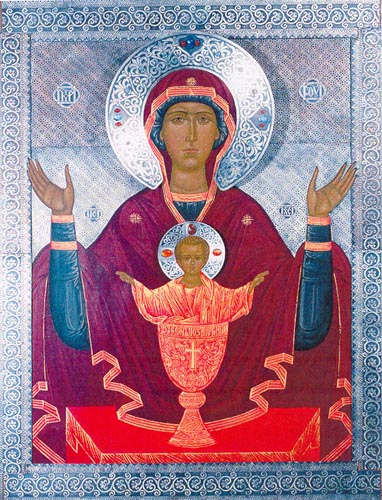 | | | Icon of the Virgin "The Undrinkable Bowl". 85õ60. Wood, levkas, egg tempera, framework with silvering. Transfiguration church (Ekaterinburg) | |